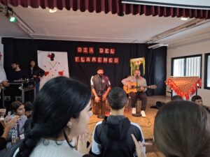 Uno de los momentos más esperados de la mañana fue la actuación en directo de un grupo flamenco invitado, que ofreció una exhibición de cante, guitarra y baile, acercando al público la esencia del flamenco en vivo y despertando un gran interés entre el alumnado.